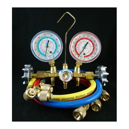 Sight glass Brass testing manifold body with hook, hose holder and two alloy hand-wheels.